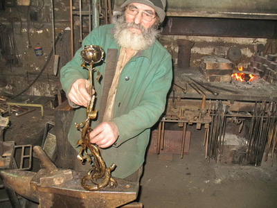 Кузнец и Роза Мастер-кузнец Илья Цуркан пригласил меня в кузню, где он со своим напарником Иваном Ивановичем творят и рождают удивительные вещи.20 лет назад я создавал свой велосипед - для этого тоже требовалась работа с металлом и огнём. Мне это близко. знакомо и интересно. Создавал я свой велосипед в лаборатории сварки, где три кандидата наук изготавливали ворота, решётки, люстры (1994-95). Прутки раскалялись до красно-белого состояния в витках индуктивной катушки и потом с ними делали всё что хотели - гнули, скручивали, плющили, протыкали отверстия и т.д. Нечто похожее я увидел и в мастерской Цуркана. Через дверь с известным плакатом мы проходим в кузню. |