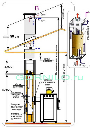 | См. дымоход завода ПетрозаводскМаш в Карелии Универсальный. дымоход (с шамот. кирпичами) Дымоход в метал. коробе. Прометрон - Схема печи с дымоходом в метал. коробе . Сэндвич-дымоход не годится для банных печей, и Шидель не очень подходит (все они предназначены для водогрейных котлов, после которых дым не очень горячий) |